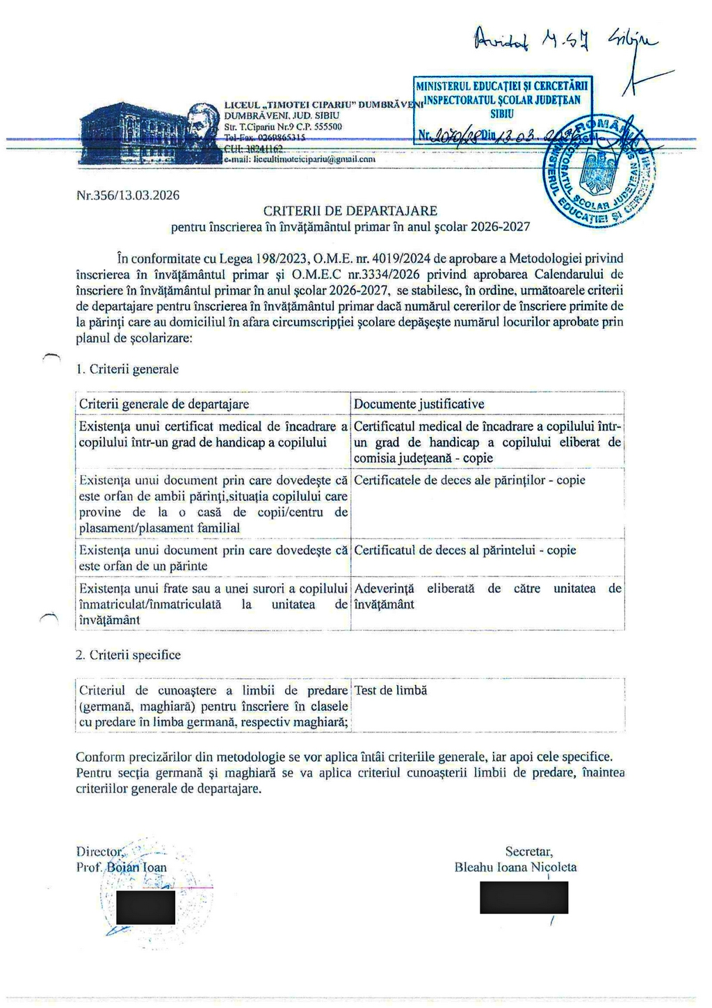 PROCEDURĂ OPERAȚIONALĂ SPECIFICĂ A LICEULUI TIMOTEI CIPARIU DUMBRĂVENI DE DISTRIBUȚIE ALEATORIE A ELEVILOR ÎN FORMAȚIUNILE DE STUDIU