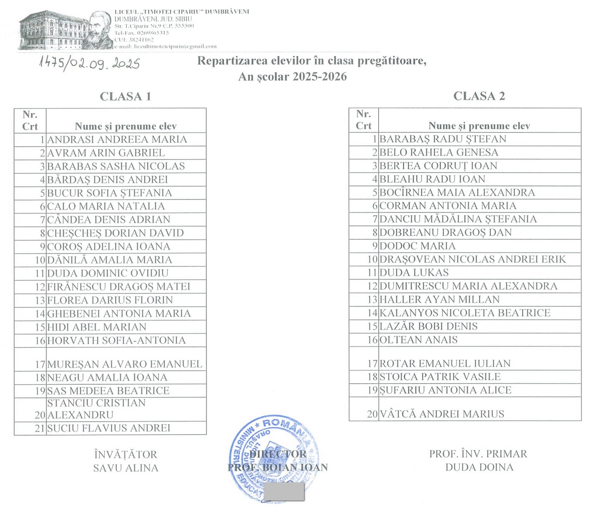 Lista elevilor admisi la Clasa Pregătitoare 2025-2026- Etapa I